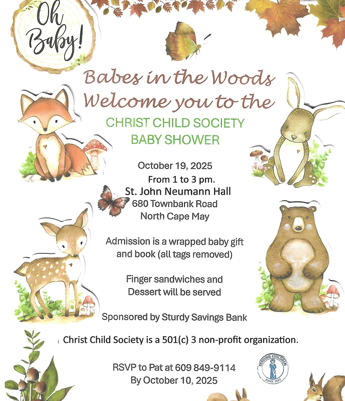 Our annual baby shower will be held Oct. 19, 2025, from 1pm-3pm, at St. John Neumann Hall, 680 Townbank Rd., North Cape May, NJ. Our theme this year is Babes in the Woods, and Admission is a wrapped Baby Gift and a book with all tags removed. Finger Sandwiches, Dessert & Beverages will be Served. This event is sponsored by Sturday Savings Bank. Please RSVP to Pat Orr 609-849-9114 by Oct. 10th.
